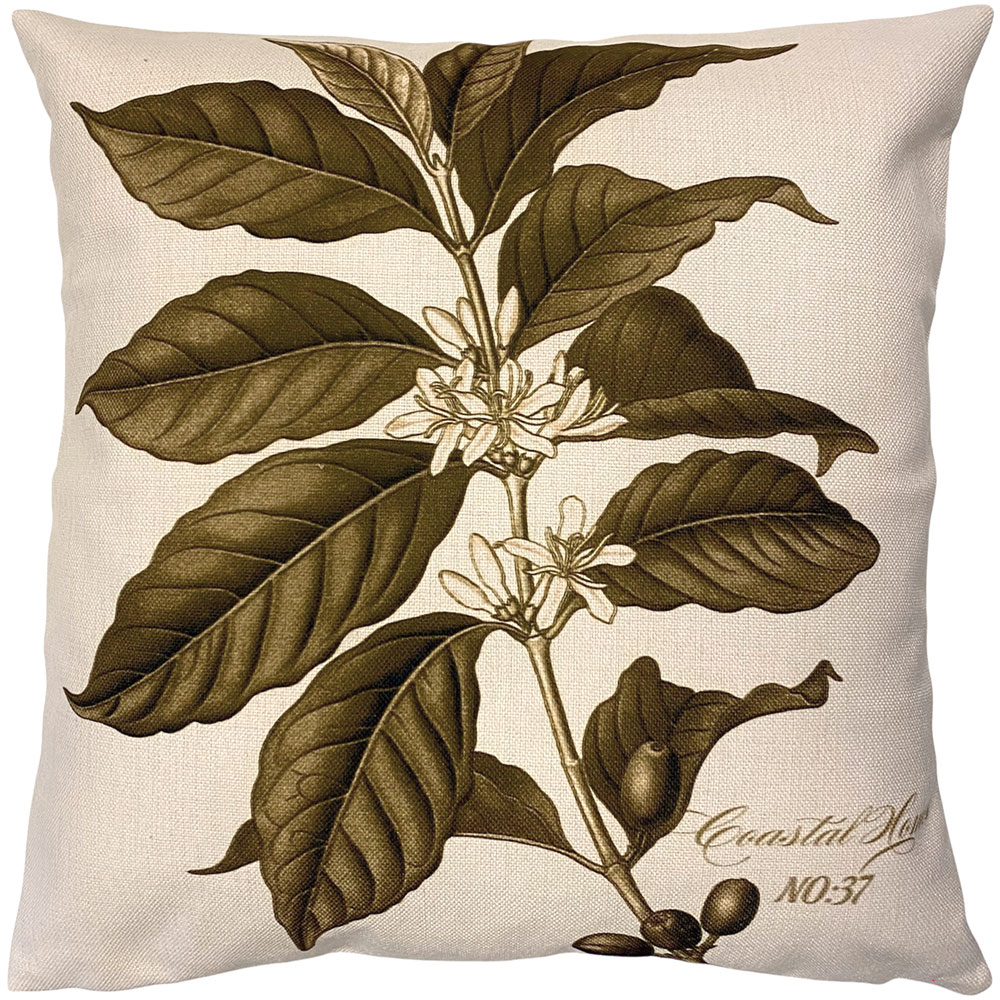 Mysigt kuddfodral med kaffeplanta på naturfärgad väv med tydlig stryktur. Kuddöverdraget håller hög kvalitet i väv och är tillverkat i en kraftigare blandning av syntet, bomull och lin.