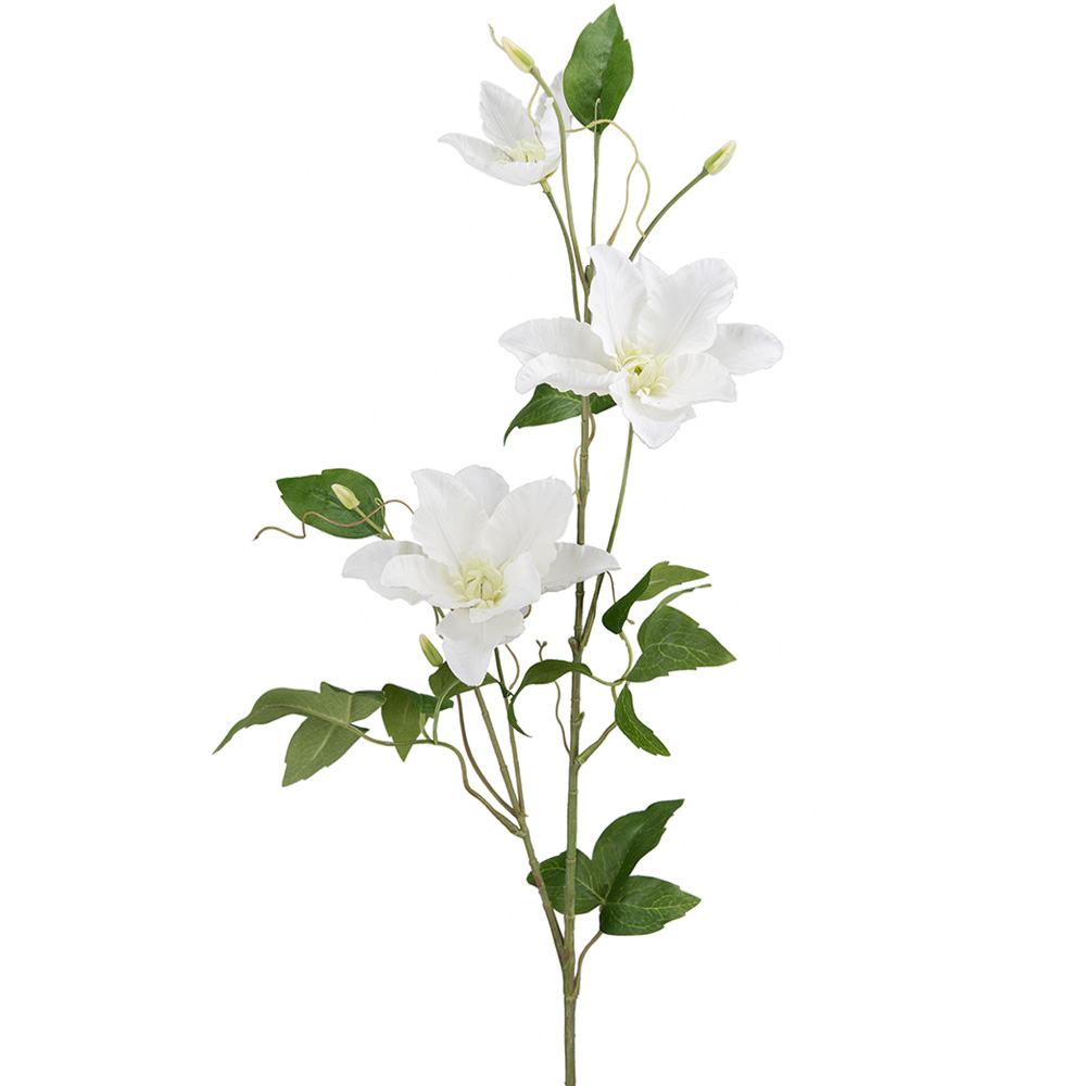 Konstgjord vit Clematis i ett väldigt vackert och naturtroget utförande från Mr.Plant. Huvudstjälk delar sig ca 36-37cm upp till flera bladiga kvistar med knoppar och 3 blommor.